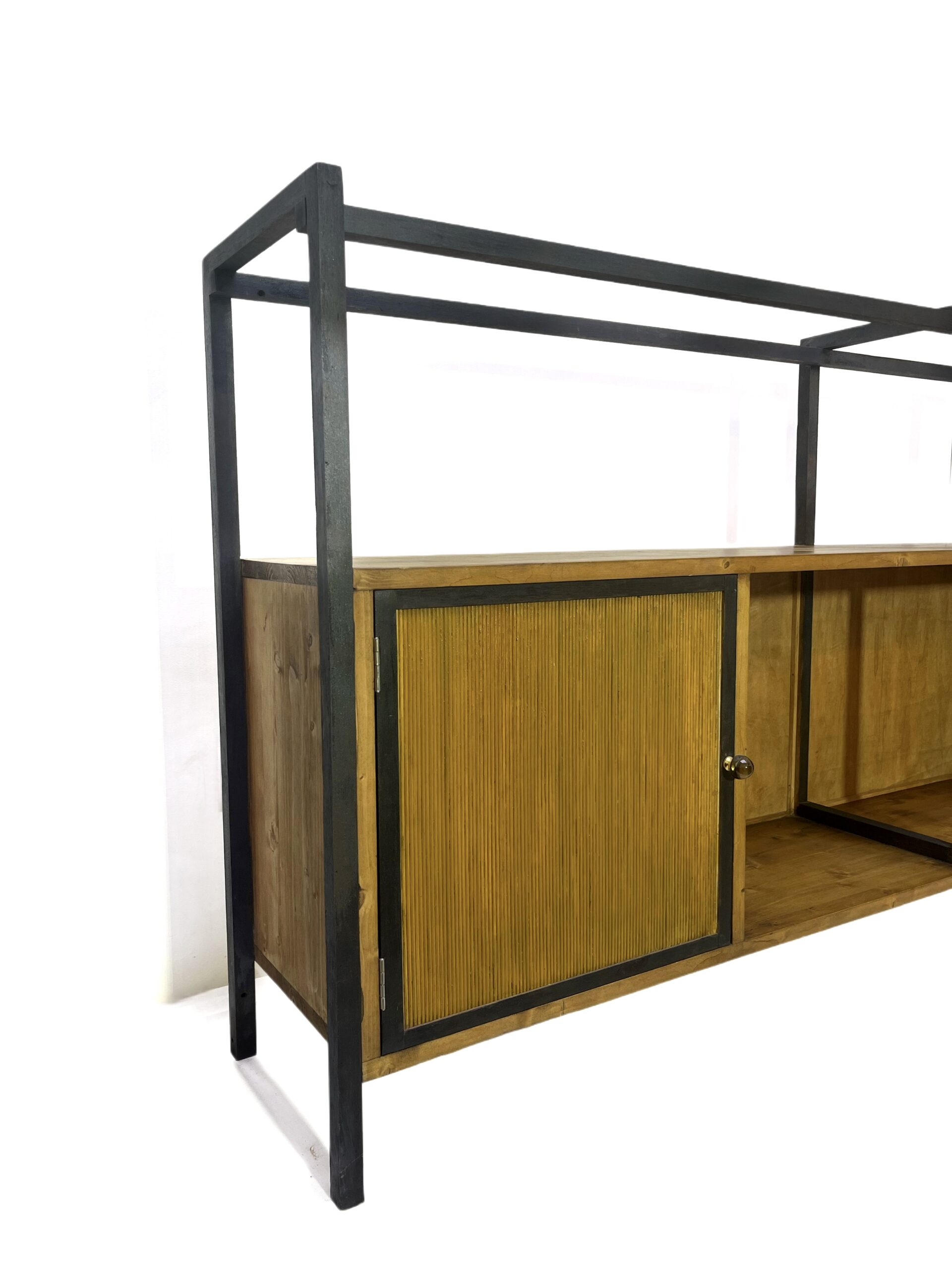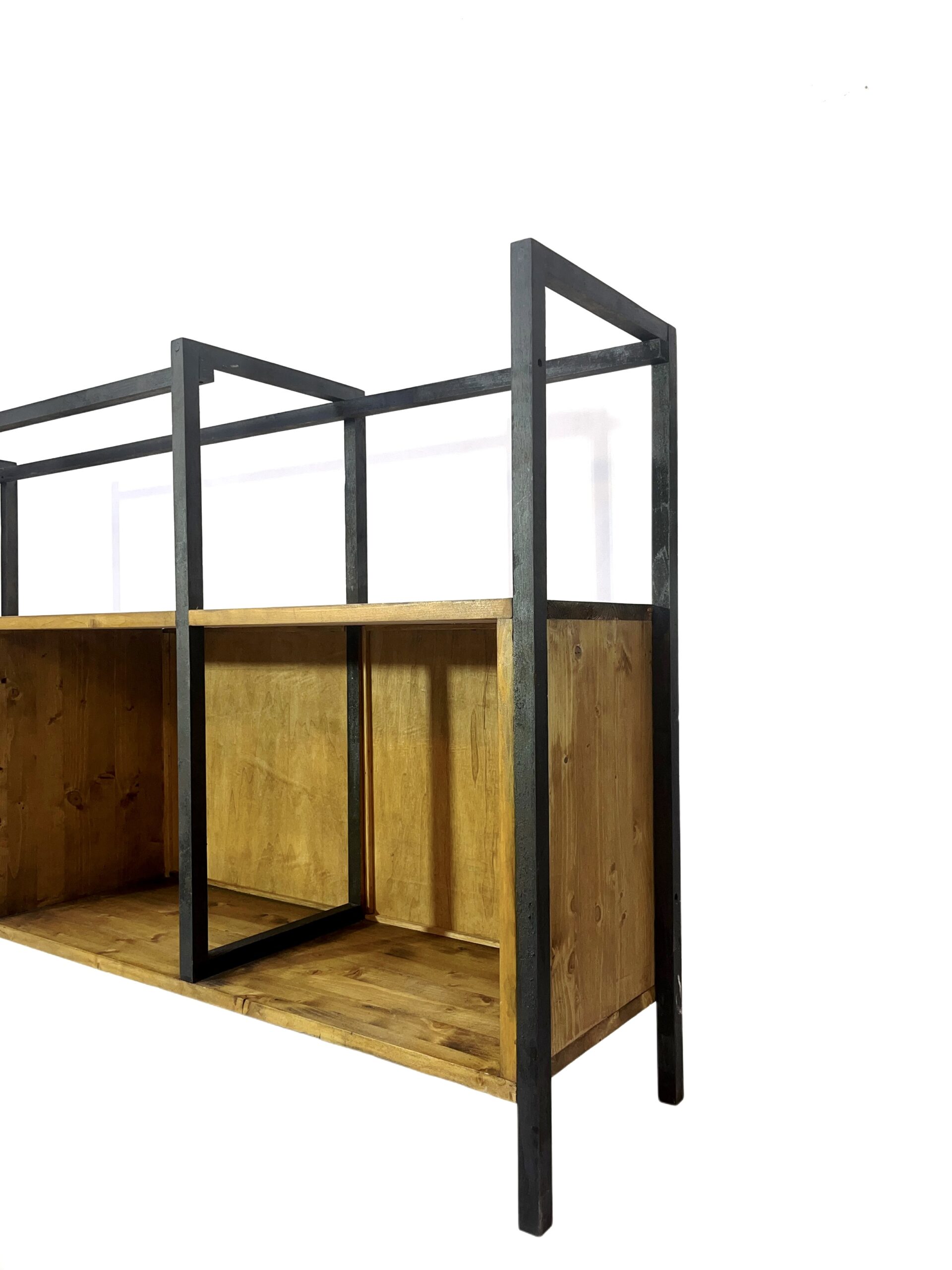 La struttura in legno emula il metallo nero, recuperata e riadattata, contrasta armoniosamente con i caldi toni del legno massello, scelto con cura per la sua resistenza e bellezza.